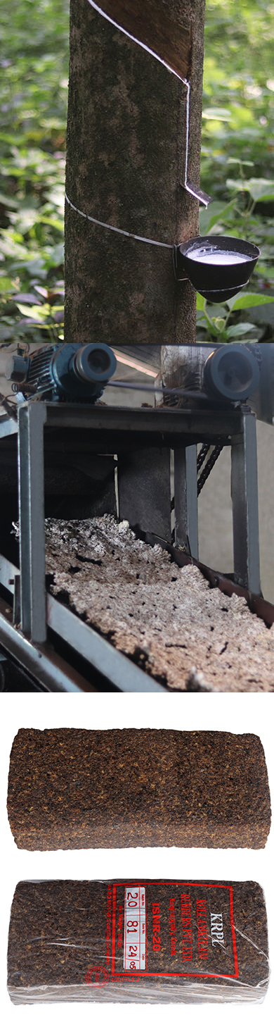 Natural Rubber is obtained from rubber trees as Latex and Cup lump/Field coagulam. Latex is processed into Sheet Rubber (RSS grades & unsmoked sheet) and Preserved Latex Concentrates. Field coagulam/Cup lump is used as raw material for processing Technically Specified Rubber (TSR).