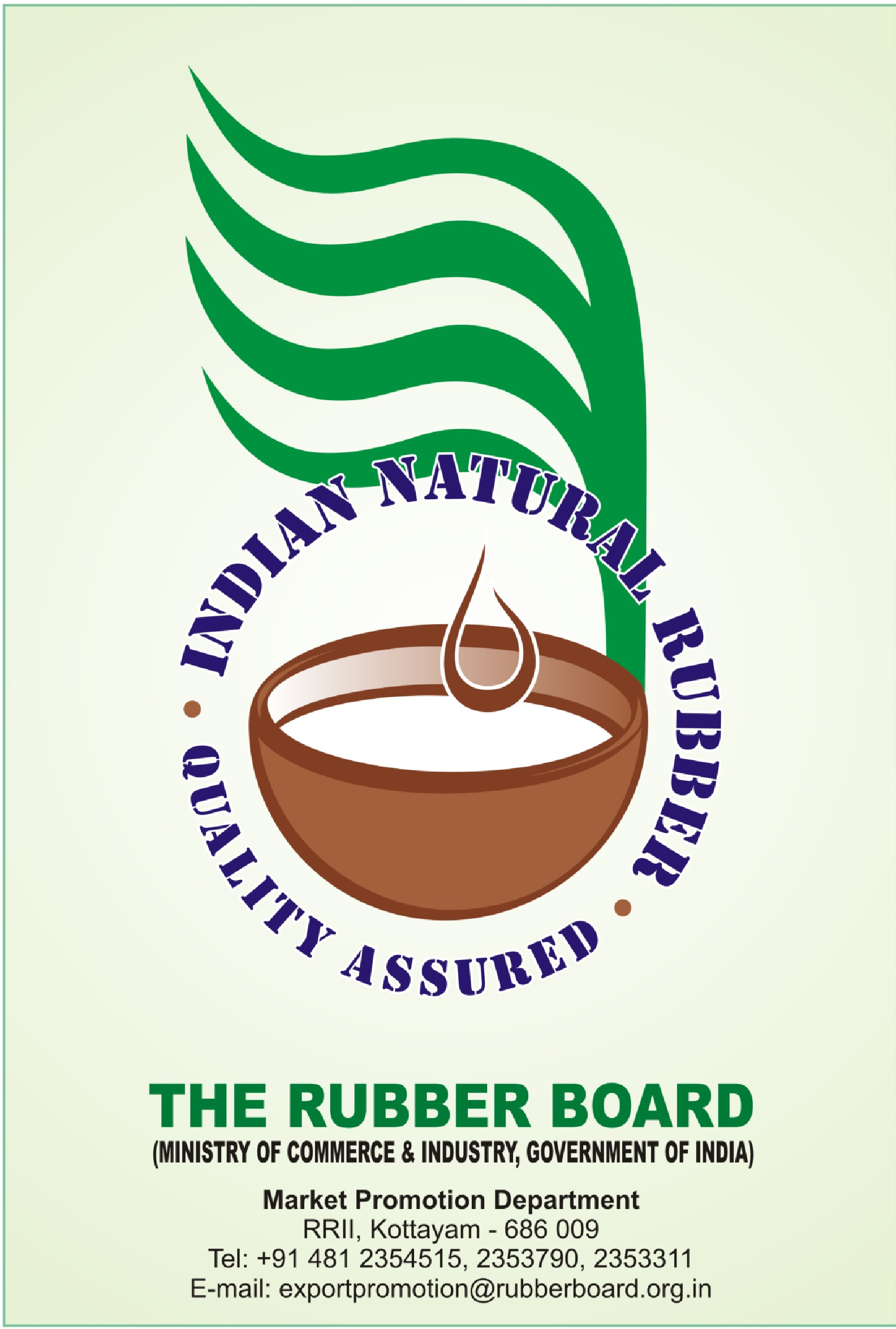 Natural Rubber is the preferred raw material because of its unique qualities when compared to other elastomers including synthetic rubber. India stands fourth place in the production of natural rubber and performance of Indian Natural Rubber in the international market, has acclaimed a commendable position and has been recognised for its high quality by many importing countries. The Rubber Board provides a transparent platform to promote export by ensuring the quality of rubber and ensures efficient market deliverables so that overseas buyers can be assured of the quality in trading of rubber with India. As branding is essential to create an identity for rubber and to distinguish Indian natural rubber in the world market, the Rubber Board took the initiative of branding rubber and christened “INDIAN NATURAL RUBBER” with a logo as an umbrella brand for rubber produced and marketed as per specifications defined. Samples are drawn and tested from each shipment and a brand certificate is issued to the exporter and a copy is forwarded to the buyer. This brings confidence among the buyers about the quality of natural rubber sourced from India.