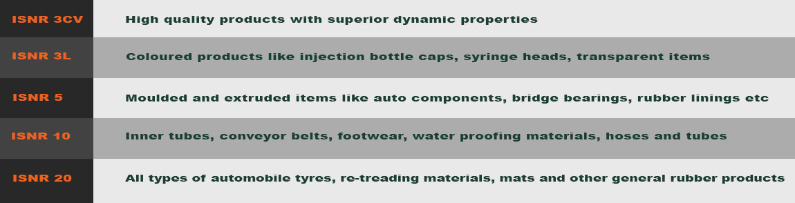 ISNR 20 is processed as per the specifications laid by Bureau of Indian Standards under IS 4588 - 1986. Kollamkulam Rubbers ensures consistent quality products to the customer by a three pronged quality approach – control of inputs, control of process and control of outputs. We are governed by our quality policy in this endeavour of providing superior quality products to our customers at all times. It also works as our policy statement as we believe our primary duty is in the quality and timely delivery we offer to our customers.