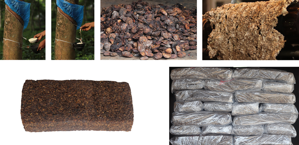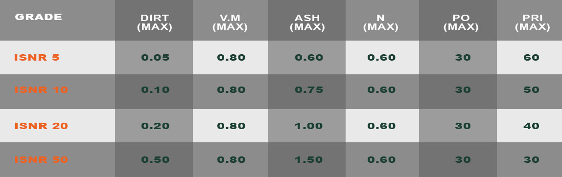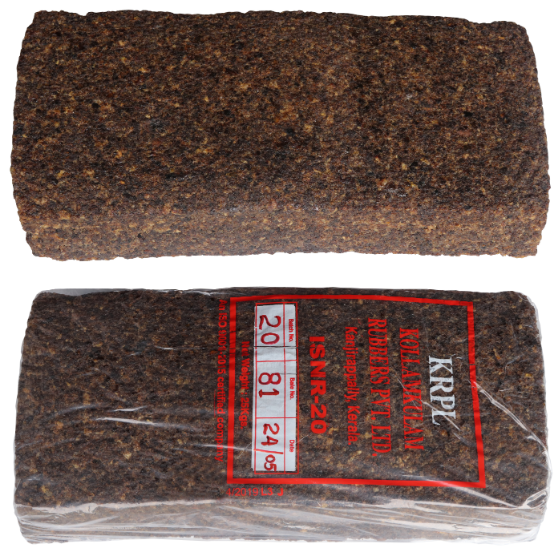 Field coagulam and unsmoked sheet are the raw materials for processing ISNR. Field coagulam consists of cup lumps and tree lace removed at the time of tapping of rubber trees. These raw materials are soaked in water and passed through various machines for cleaning and drying. It is then pressed into blocks of size 690 x 330 x 150 mm, weighing 25 Kgs and packed in LDPE covers.